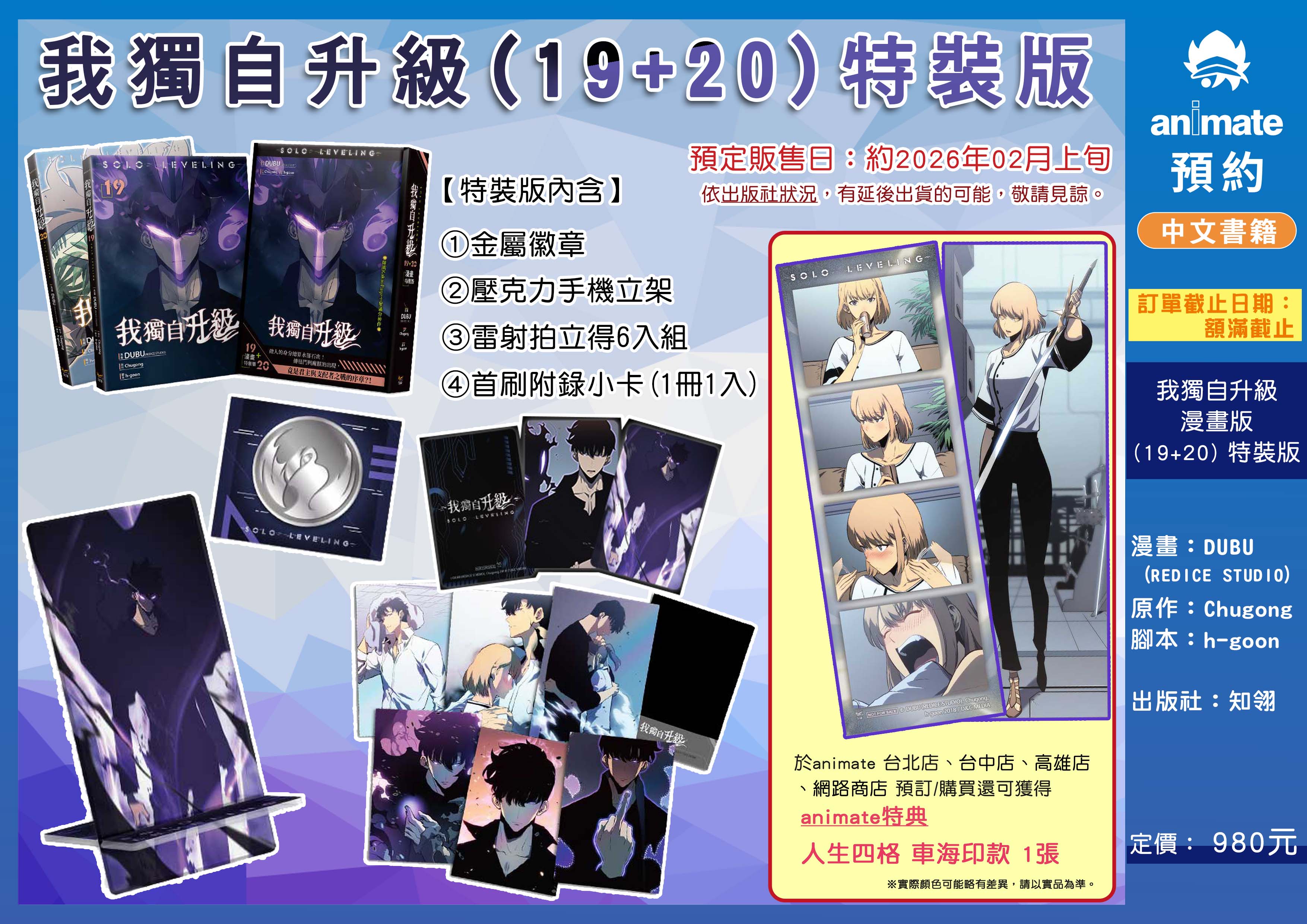 《特裝版內容》●《我獨自升級》第19集、第20集●壓克力手機立架●金屬徽章●雷射拍立得(共6款)★animate獨家特典:人生四格書籤卡【車海印】一張